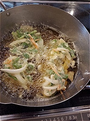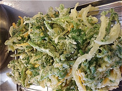 春菊は天ぷらかなと新玉葱と人参を加えてかき揚げに・・