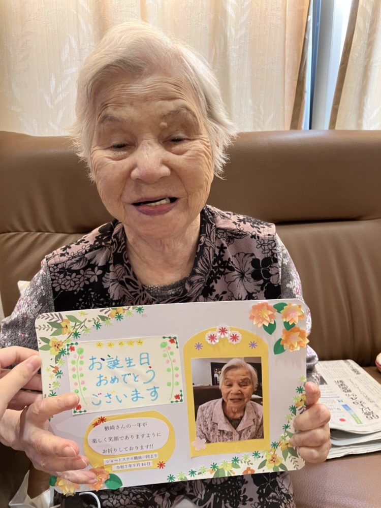 利用者の方皆でお祝いし、お誕生日カードをお渡しすると