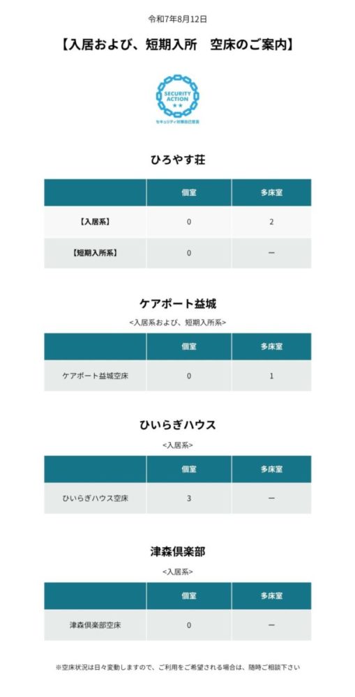 入居および、短期入所 空床のご案内