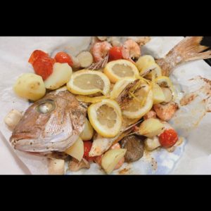 鯛は香草焼きに、まわりにトマト・ジャガイモ・エリンギを添えてオーブン焼きに♡