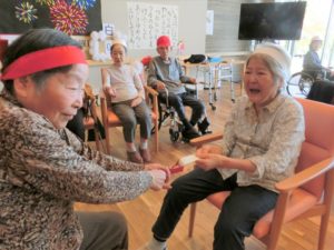 職員によるうまい棒競争は北ユニット、南ユニット共に赤組が圧勝でした🙌