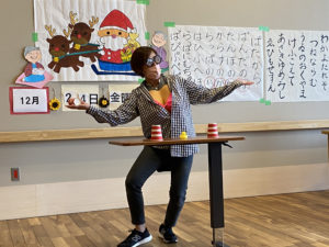 準備運動が終わると”職員マジシャン”が登場です🎩