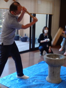 熱~いまなざしと、拍手の応援にて、職員が力いっぱい餅つきを行いました。