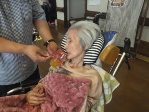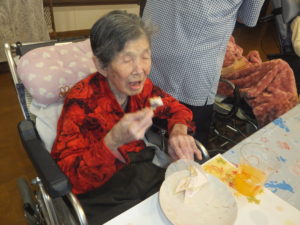 お菓子とジュースを用意して、誕生日ケーキを食べて頂きました。