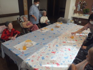 お菓子とジュースを用意して、誕生日ケーキを食べて頂きました。