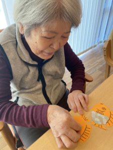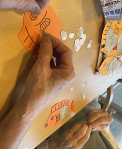 職員お手製の壁絵を準備し、鯛の鱗を貼る作業を行いました!!