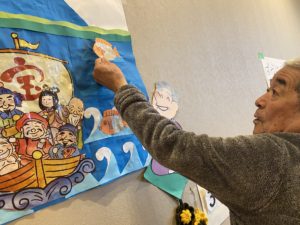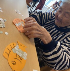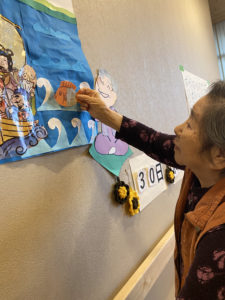 職員お手製の壁絵を準備し、鯛の鱗を貼る作業を行いました!!