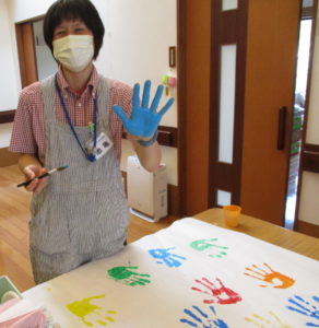 広用紙にご利用者様やスタッフの手形をペタペタ…どのようなものが出来るのか!?まだ完成出来ていないのでお見せ出来ず…