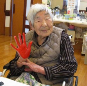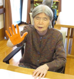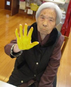 広用紙にご利用者様やスタッフの手形をペタペタ…どのようなものが出来るのか!?まだ完成出来ていないのでお見せ出来ず…