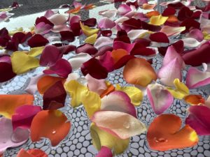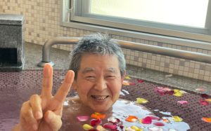 利用者様は浴室に入りバラを見て「うわ~今日はバラが浮いとる」「初めてバラ湯に入ったよ」と花びらに囲まれて満面の笑み😆✨