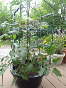 4月の中旬にまずはトウモロコシを種から植えて、その後大きな鉢にミニトマト苗を植えました。