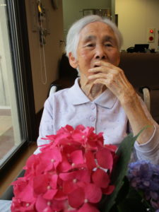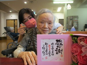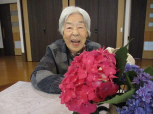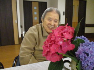 「この花も綺麗でしょ?」と娘様からのプレゼントを嬉しそうに職員に見せて下さります(^^♪