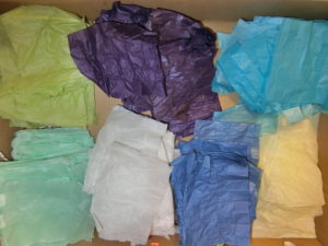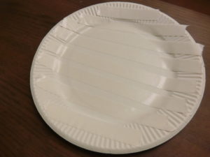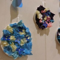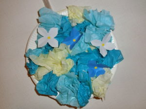 紙皿に両面テープを貼って、くしゃくしゃにした、お花紙を