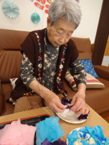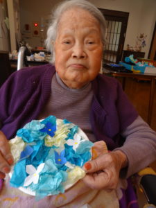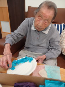 先に完成品をお見せすると、「難しか~片手じゃできんよ~」と