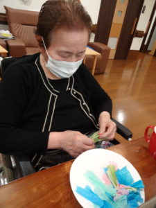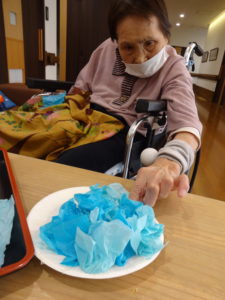 来月の壁面飾りに向けて、工作レクリエーションを行いました。