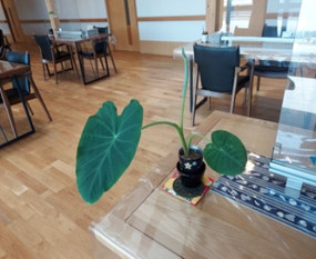 今の食卓花は、里芋です。里いもをコップに置いた時は、こんなに大きく愛らしくなるとは思いませんでした。