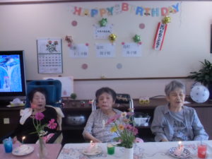 生け花を飾り誕生日者のみで記念撮影。
