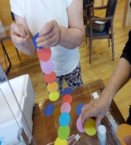 折り紙で作った三角の折り紙細工を職員と2人で糸でつないでいるところです。