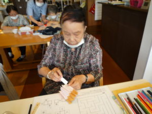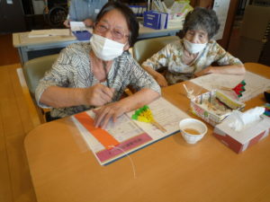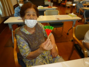次に夏の風物詩としてスイカの飾り作りを行いました。みなさん手先が器用でスイカの種や皮の黒い筋も