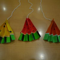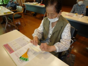次に夏の風物詩としてスイカの飾り作りを行いました。みなさん手先が器用でスイカの種や皮の黒い筋も