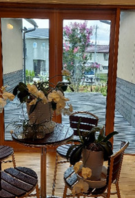 そして中央玄関から見た風景です。胡蝶蘭の奥の百日紅に2色の花が咲きました。