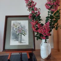 ひいらぎの広大な庭には、百日紅が満開です。暑い夏に咲く花木です。絵画に添えてみました。
