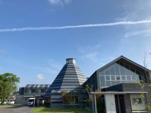 思わず飛行機雲をバックに、ケアポート益城の建物の写真をスマホでパチリ📷❗😊