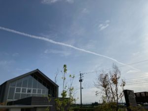 今朝出勤する時に、ふと空を見上げると、飛行機雲が一直線に流れていました!!😲✨