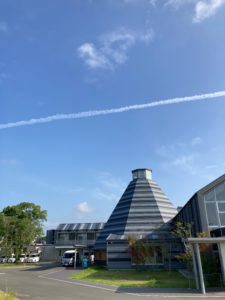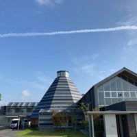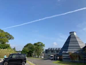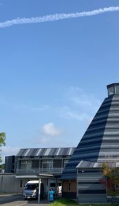 思わず飛行機雲をバックに、ケアポート益城の建物の写真をスマホでパチリ📷❗😊