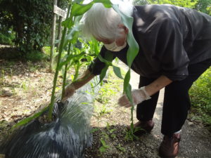 順調に大きくなってきたトウモロコシ!利用者さんと一緒に途中で肥料を追加する【追肥】を行いました。
