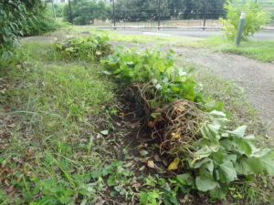 葉っぱが畝の下まで伸びてくると、地面に触れている所の茎から根を出して、肝心のお芋に養分が行かなくなるとの事で、