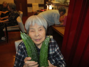「こんなに大きなゴーヤは久しぶりにみた」「こら、おいしかろ~」と頂いた立派なゴーヤと一緒に記念撮影。