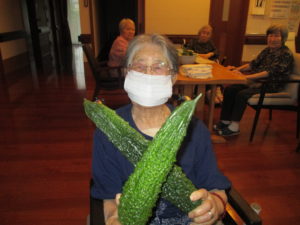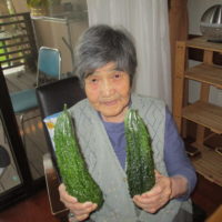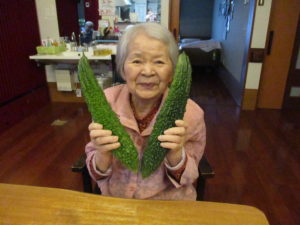 「こんなに大きなゴーヤは久しぶりにみた」「こら、おいしかろ~」と頂いた立派なゴーヤと一緒に記念撮影。