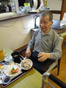 職員の気持ちのこもった御膳に「今日は刺身のあるな~久々に食べるど?」「美味しかよー」と