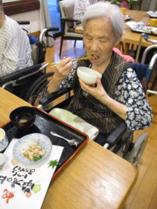 職員の気持ちのこもった御膳に「今日は刺身のあるな~久々に食べるど?」「美味しかよー」と