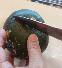 熟成十分の所に包丁を入れます。