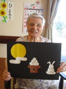 職員が準備した飾りの、”満月” ”雲” お月見団子” ”ウサギ”を皆さん思い思いに貼り付けられています。