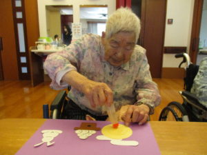 「こっでよかとね」「こらどがんして貼るとな?」「わからんけん教えて」と職員とだけではなく、ご利用者様同士会話も弾みます。