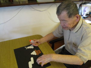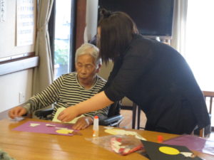 「こっでよかとね」「こらどがんして貼るとな?」「わからんけん教えて」と職員とだけではなく、ご利用者様同士会話も弾みます。