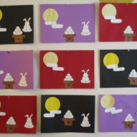 職員が準備した飾りの、”満月” ”雲” お月見団子” ”ウサギ”を皆さん思い思いに貼り付けられています。
