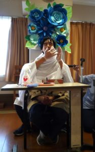 まずは男性職員による「二人羽織」です!