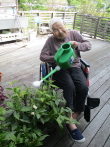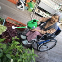 ウッドデッキで育てている植物に水やりもお願いしました🌻