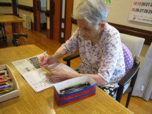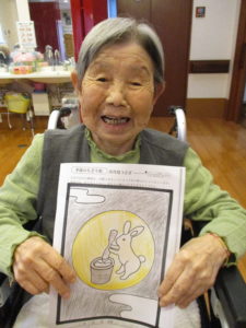 今日のレクレーションでは、十五夜に向けての塗り絵を行いました。