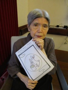 「うさぎは何色がよかね?」「今のウサギはどがん色んとのおっとね?」「月の中で餅ばつきよらす」と塗りながら会話が弾みます。