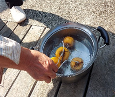 カビ防止に熱湯につけて、順に吊るしていきます。