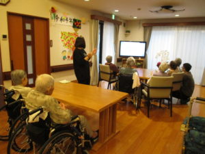 ある日は皆さん集まってカラオケをしました。歌謡曲は後日との事で今回は皆さんが知っておられる童謡などをメインに歌いました。