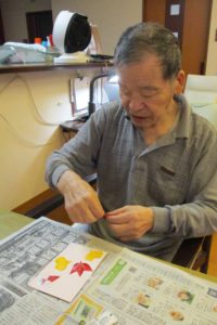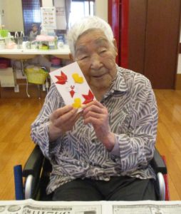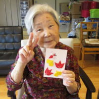 貼り絵はもみじとイチョウを上手に貼られ、裏面にはご自身の名前を書いていただきました。