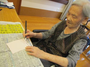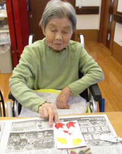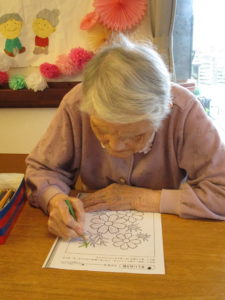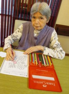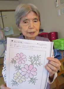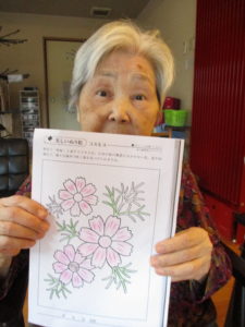 塗り絵は「コスモスば見にいきたかね」「外さん行かなん身体のなまる」と皆さん思い思いに塗られてました。