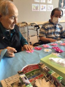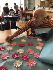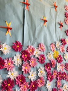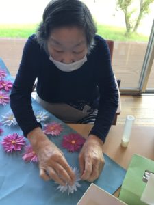 コスモスと赤とんぼを職員が作成し皆さんに貼り付けてもらいました😉🌸