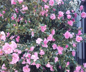 ひいらぎの庭の一角にピンクの山茶花が満開です。